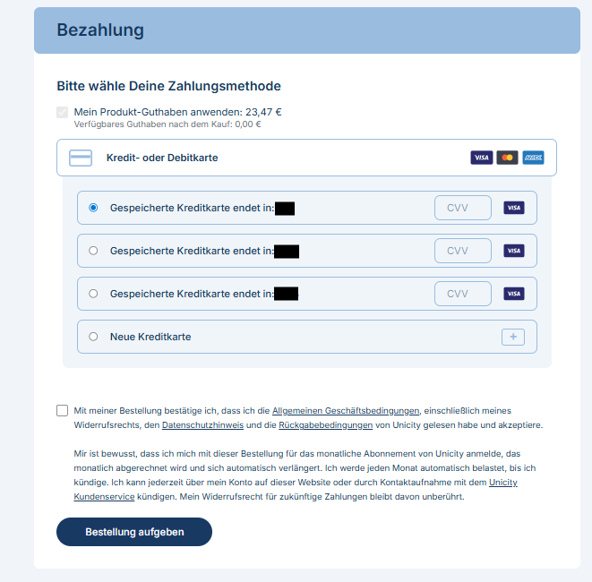 Du kannst entweder eine neue Karte hinzufügen oder eine bereits in deinem Konto gespeicherte Karte auswählen, um sie für dein Abo zu verwenden. Sobald du eine Karte zugewiesen hast, klicke auf Bestellung aufgeben, um die Einrichtung abzuschließen.