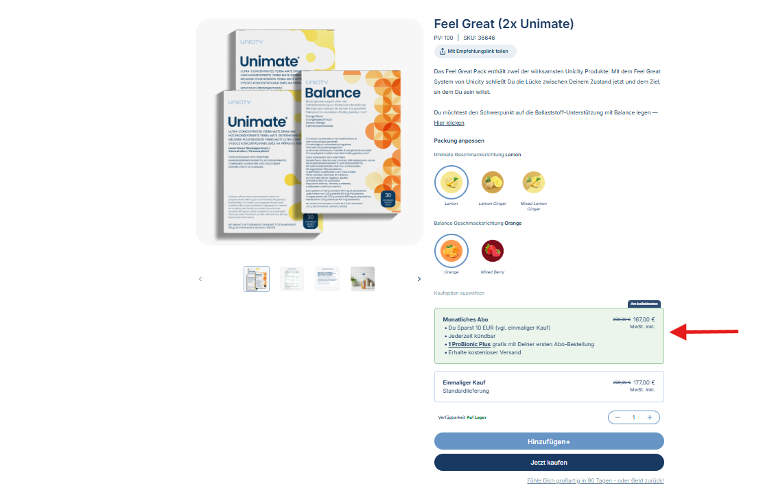 Durchstöbere den Shop und klicke auf das Produkt, das du möchtest. Wenn du es ausgewählt hast, vergewissere dich, dass die Option „Monatliches Abo“ ausgewählt ist. Klicke dann auf In den Warenkorb, um fortzufahren.