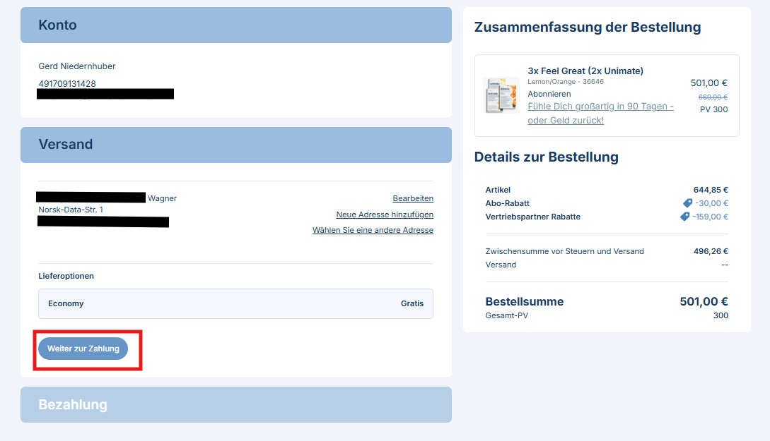 Gib die Versandadresse ein, die du für dein Abo verwenden möchtest und überprüfe dann deine Bestellübersicht, bevor du auf Weiter zur Zahlung klickst.
