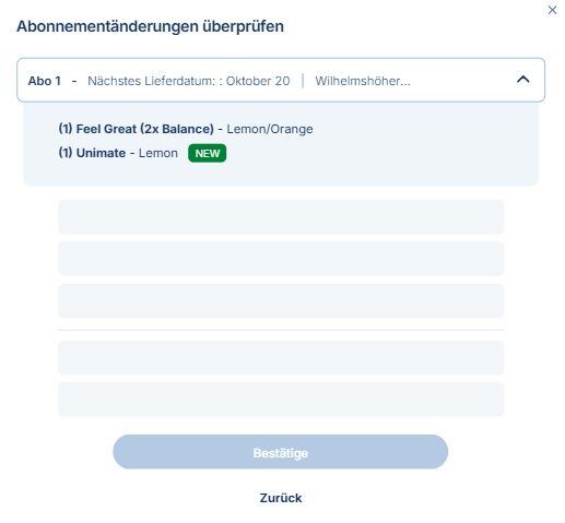 Nachdem du das Abo ausgewählt hast, dem du das Produkt hinzufügen möchtest, erscheint ein Fenster, in dem die aktualisierte Gesamtsumme für dein Abo mit dem hinzugefügten Artikel angezeigt wird. Überprüfe die neue Summe und klicke dann auf Bestätige, um fortzufahren.