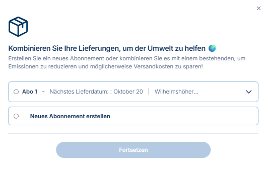 Es erscheint ein Pop-up-Fenster, in dem du die Möglichkeit hast, den Artikel zu einem bestehenden Abo hinzuzufügen oder ein neues Abo einzurichten. Triff einfach deine Wahl und klicke dann auf Fortsetzen, um fortzufahren.