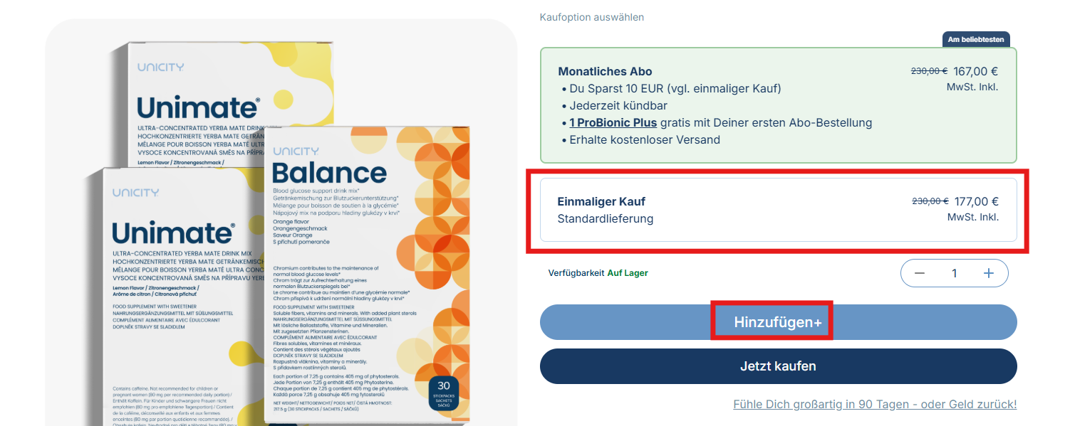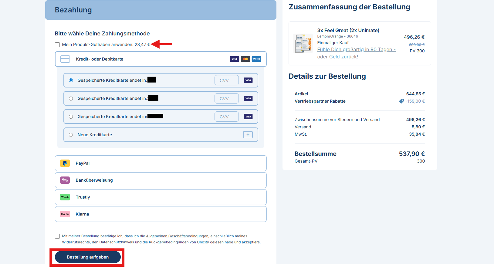 Aktiviere auf der BEZAHLSEITE das Kästchen „Mein Produktguthaben anwenden“ und fahre dann mit deiner Bestellung fort.