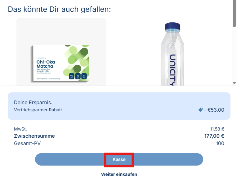 Wenn du zur Kasse gehen möchtest, klicke auf „Kasse“: Wenn du mit dem Stöbern in anderen Produkten fortfahren möchtest, klicke auf „Weiter einkaufen“.
