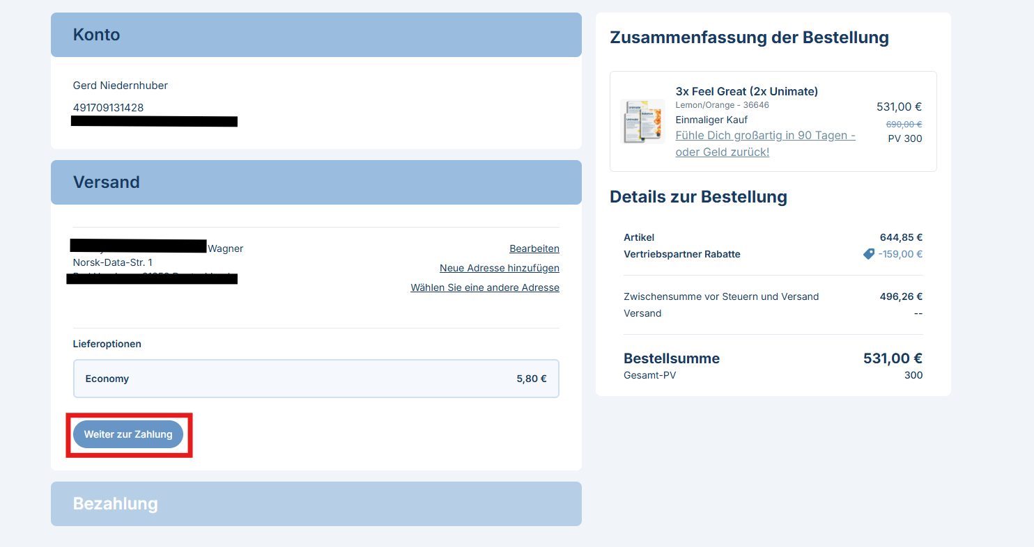 Auf der Kassenseite bearbeitest du bei Bedarf deine Versanddetails, wählst die gewünschte Lieferoption aus und klickst dann auf „Weiter zur Zahlung“.