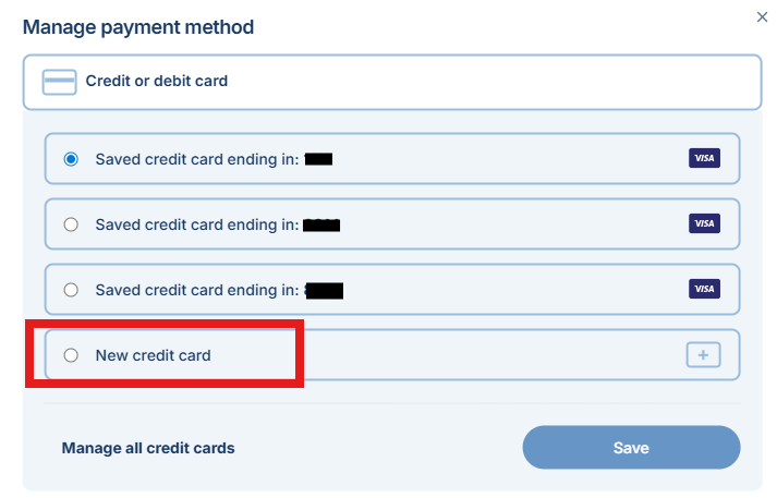 A pop-up or new section will appear. Select “New Credit Card” to begin entering your new payment details.