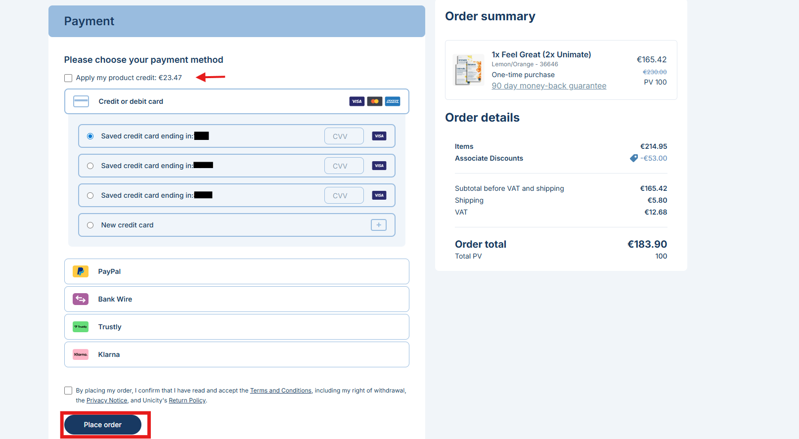 On the payment page, check the box labeled “Apply my product credit,” then continue with placing your order.