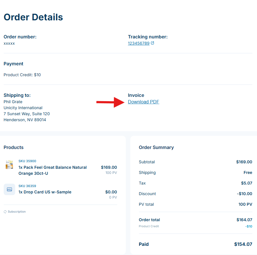 Locate the “Invoice” section of the page and click “Download PDF” to download a digital copy of your order’s invoice.